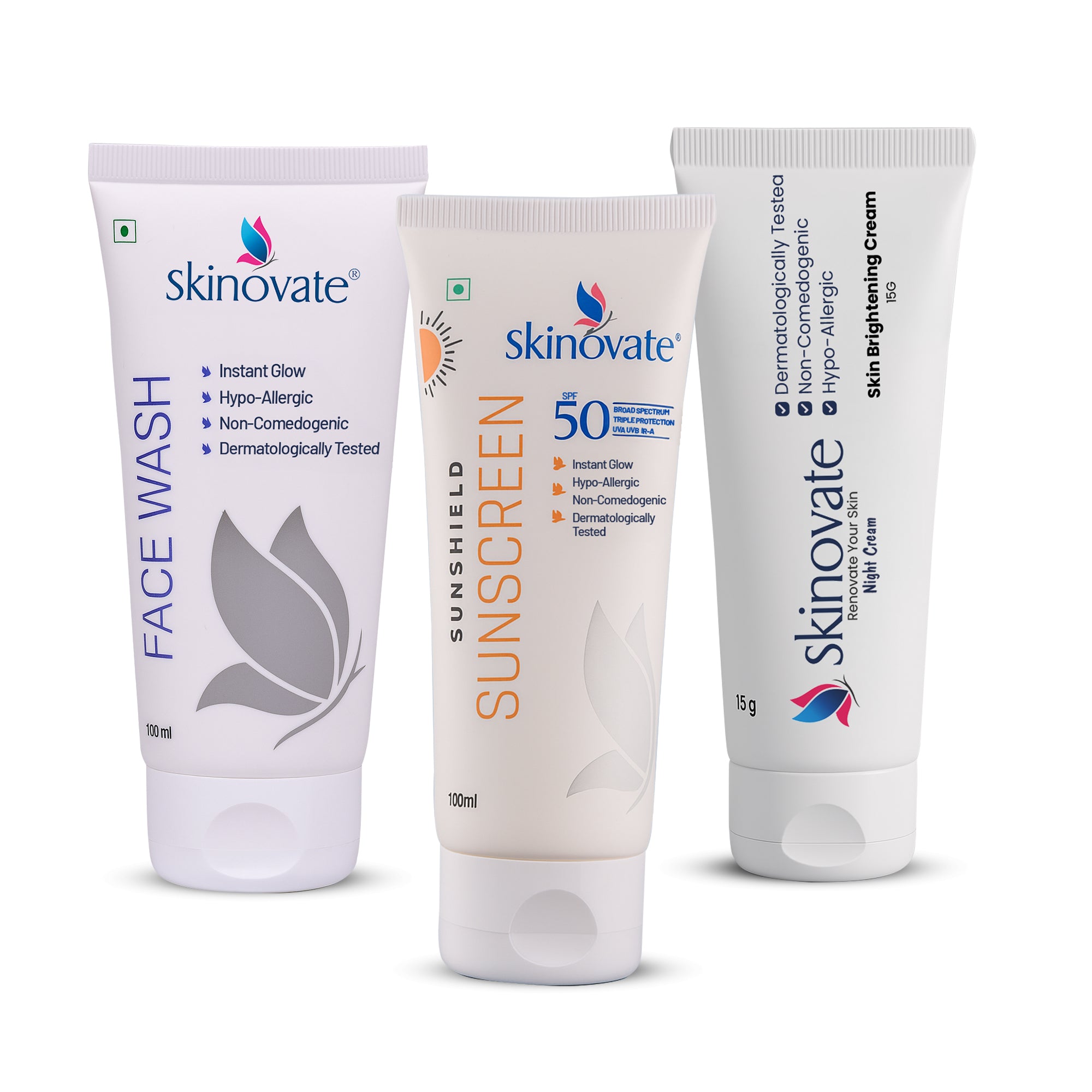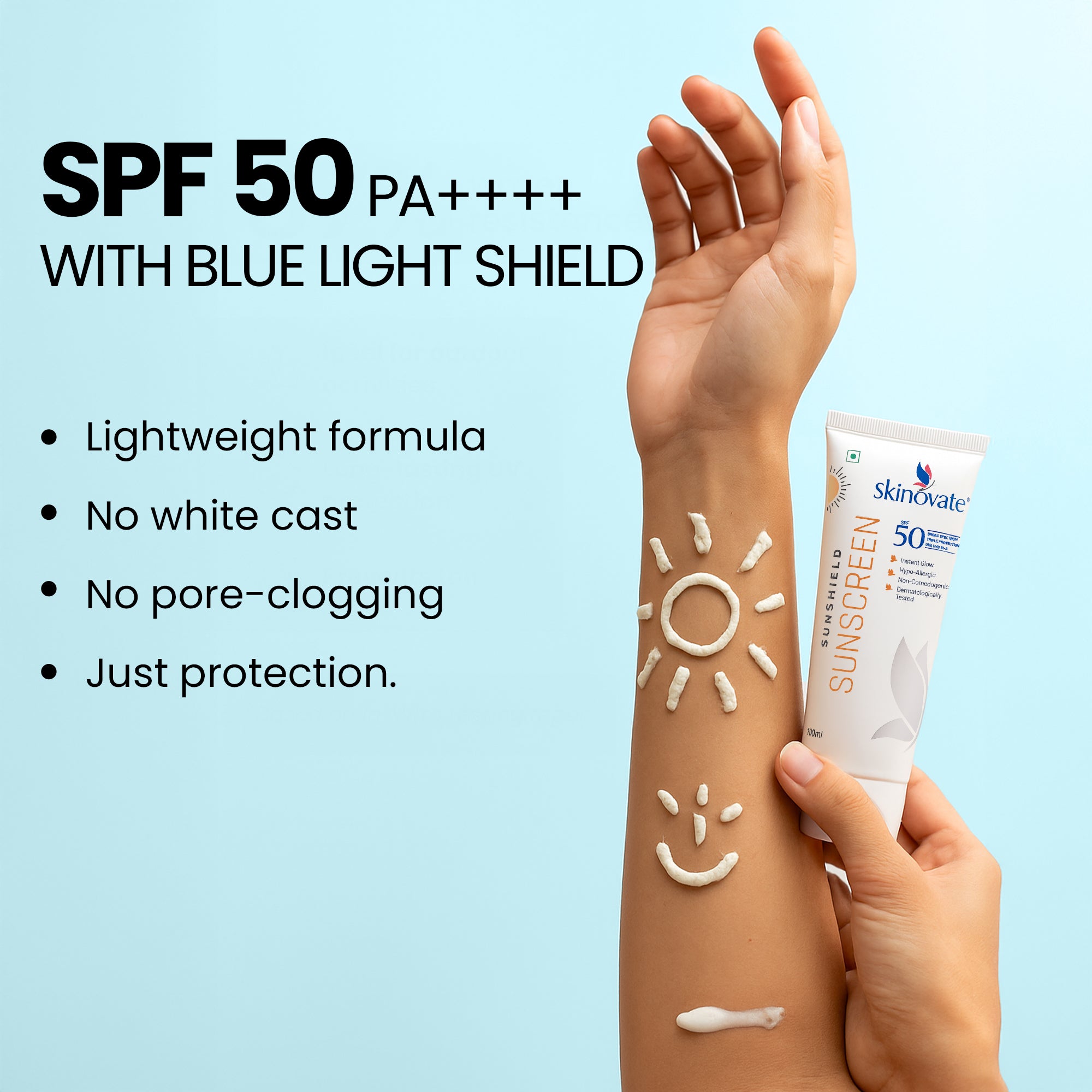 Apply Skinovate Sunscreen SPF 50 before stepping out. It offers broad-spectrum protection against harmful UVA/UVB rays while giving your skin a healthy, radiant glow. Suitable for daily use and safe under makeup.