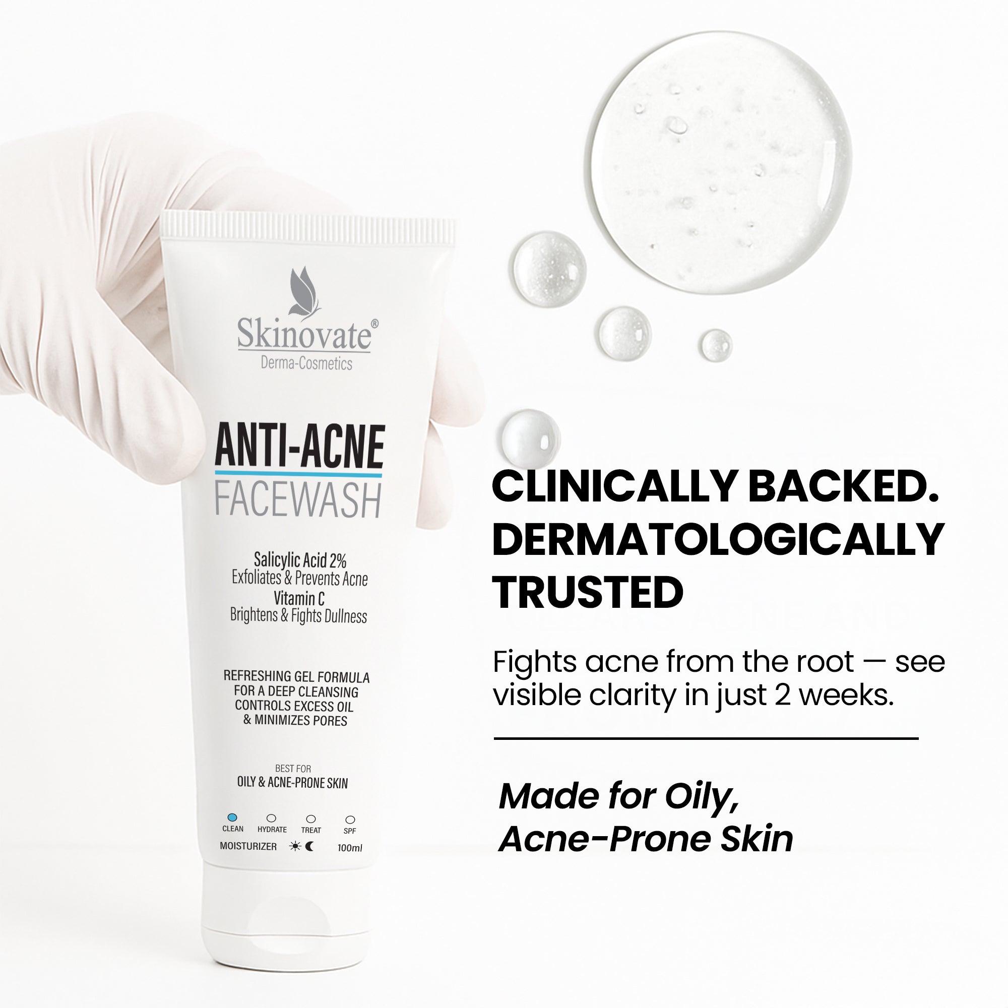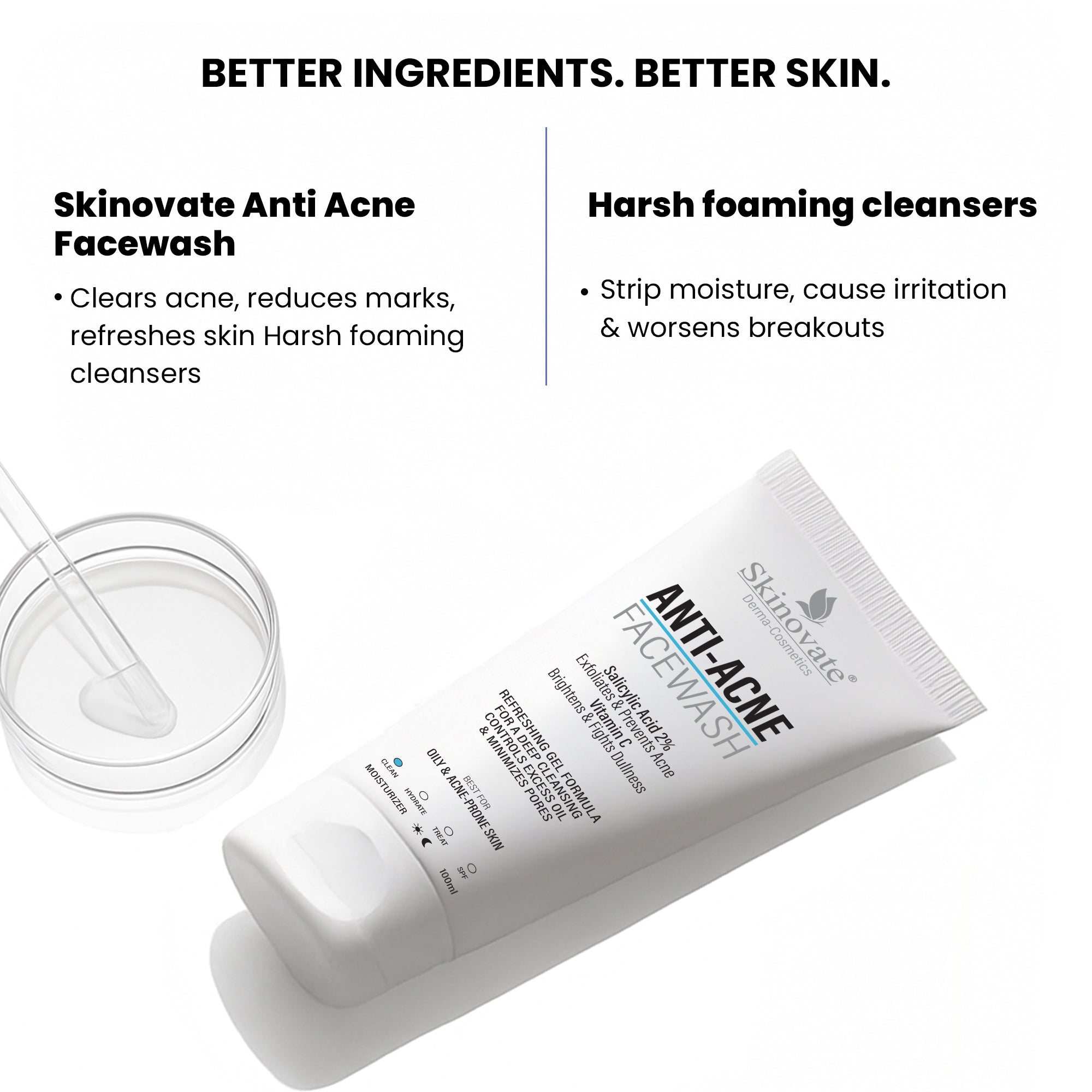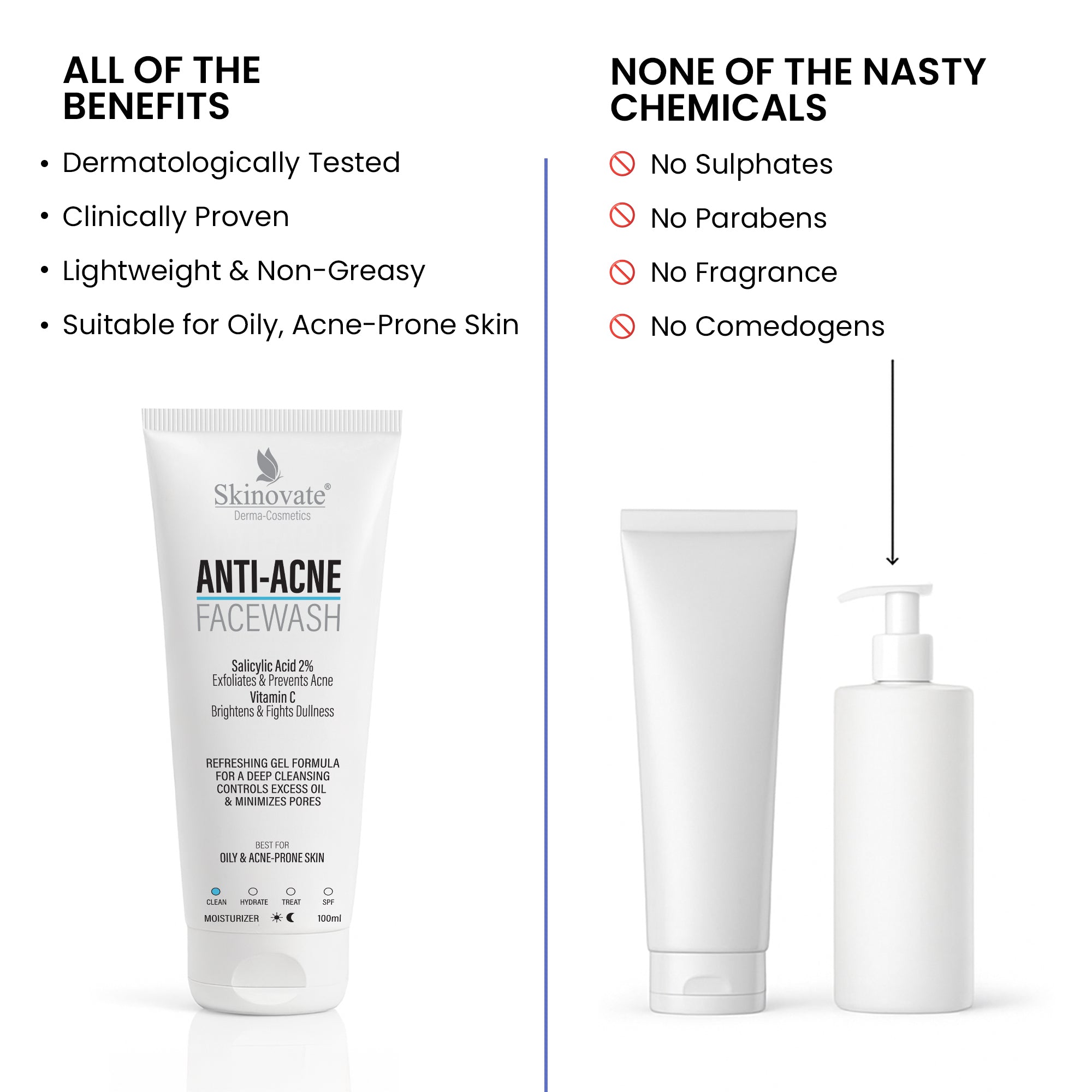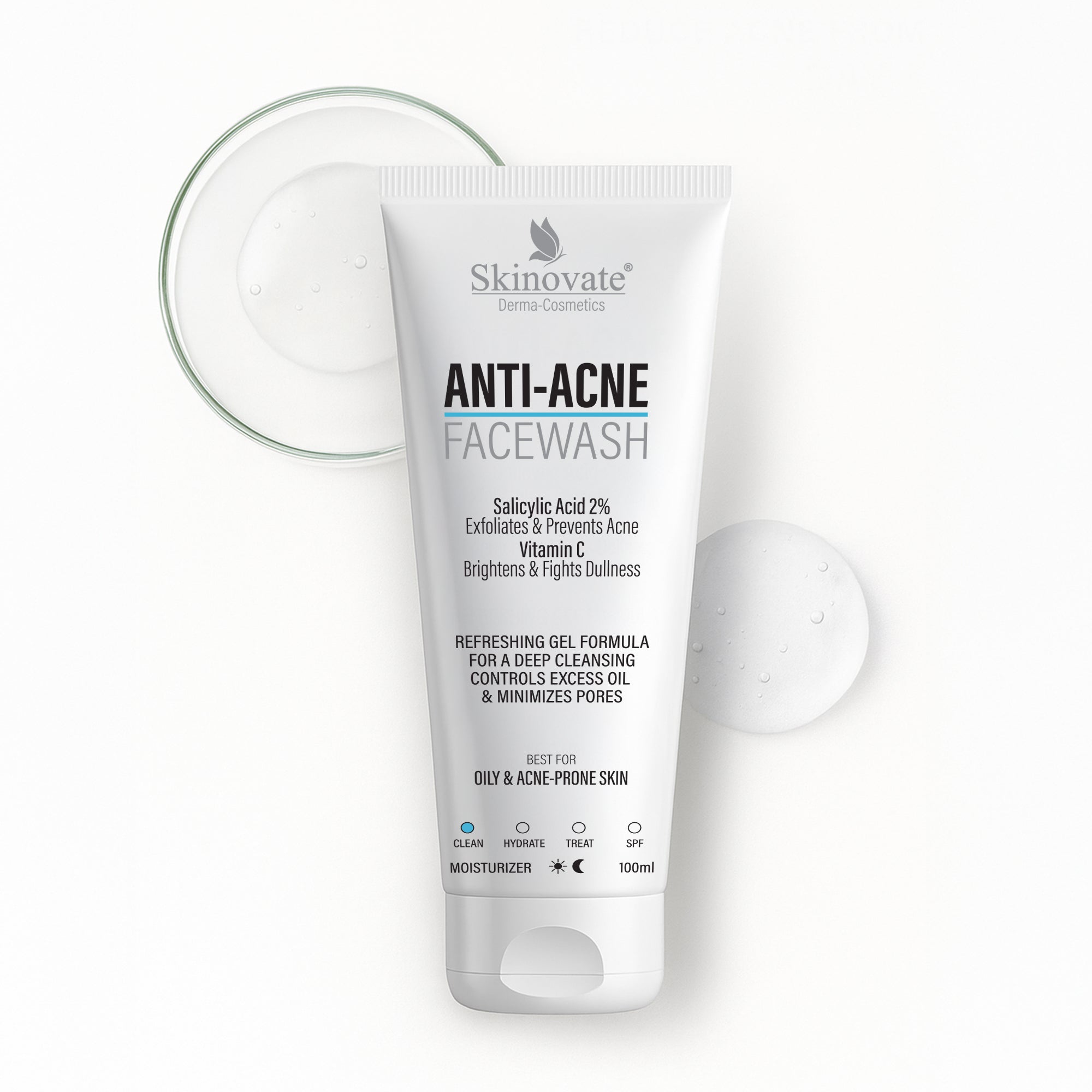 Say goodbye to stubborn breakouts with Skinovate Anti-Acne Facewash. Formulated with 2% Salicylic Acid, this powerful cleanser helps exfoliate the skin, unclog pores, and prevent future acne. Enriched with Vitamin C, it brightens dull skin and improves texture for a clear, refreshed complexion.