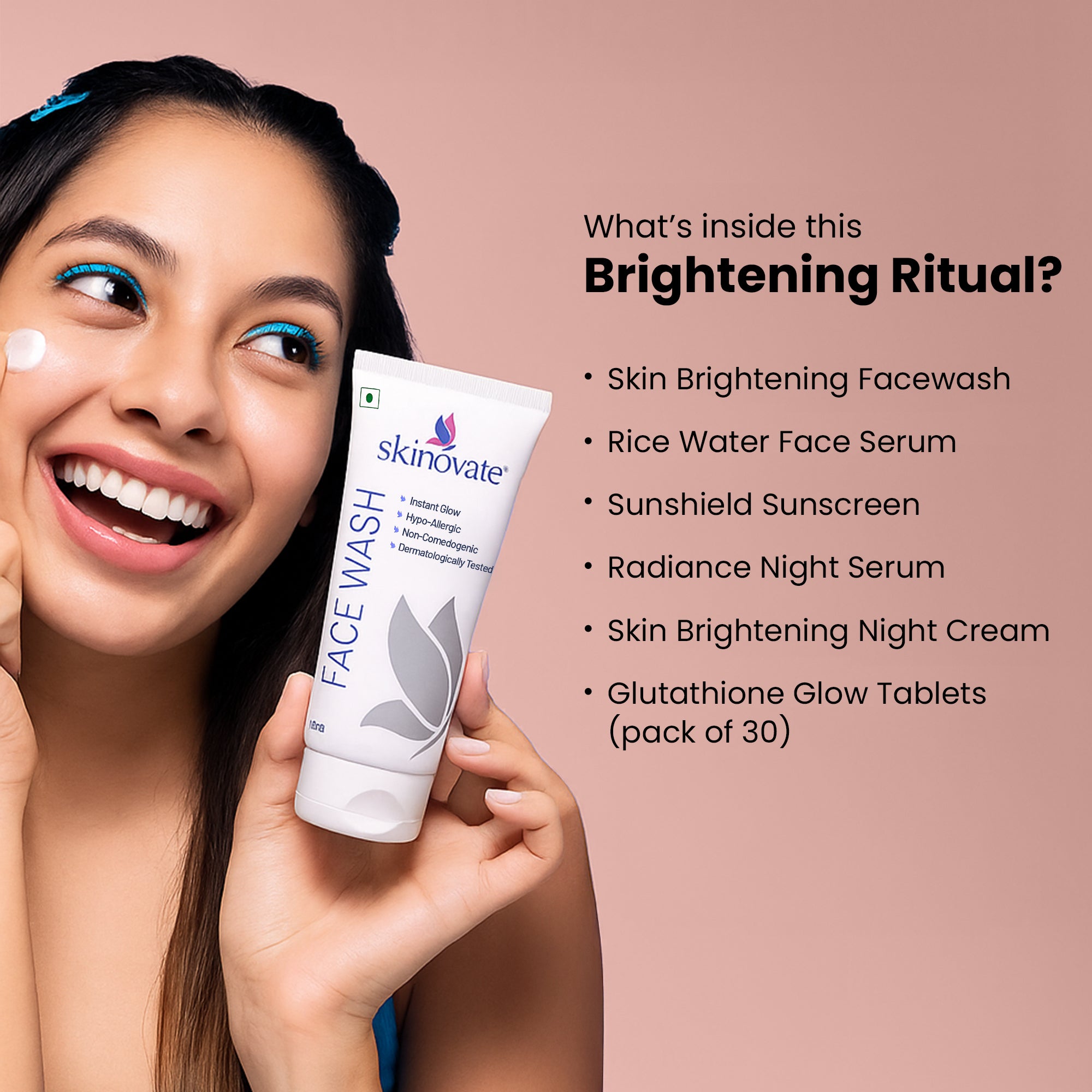 Your nighttime ritual includes Skinovate Radiance Night Serum and Skin Brightening Night Cream. The serum targets dullness, uneven tone, and fine lines, while the cream works on deep pigmentation, restoring texture and radiance as you sleep.