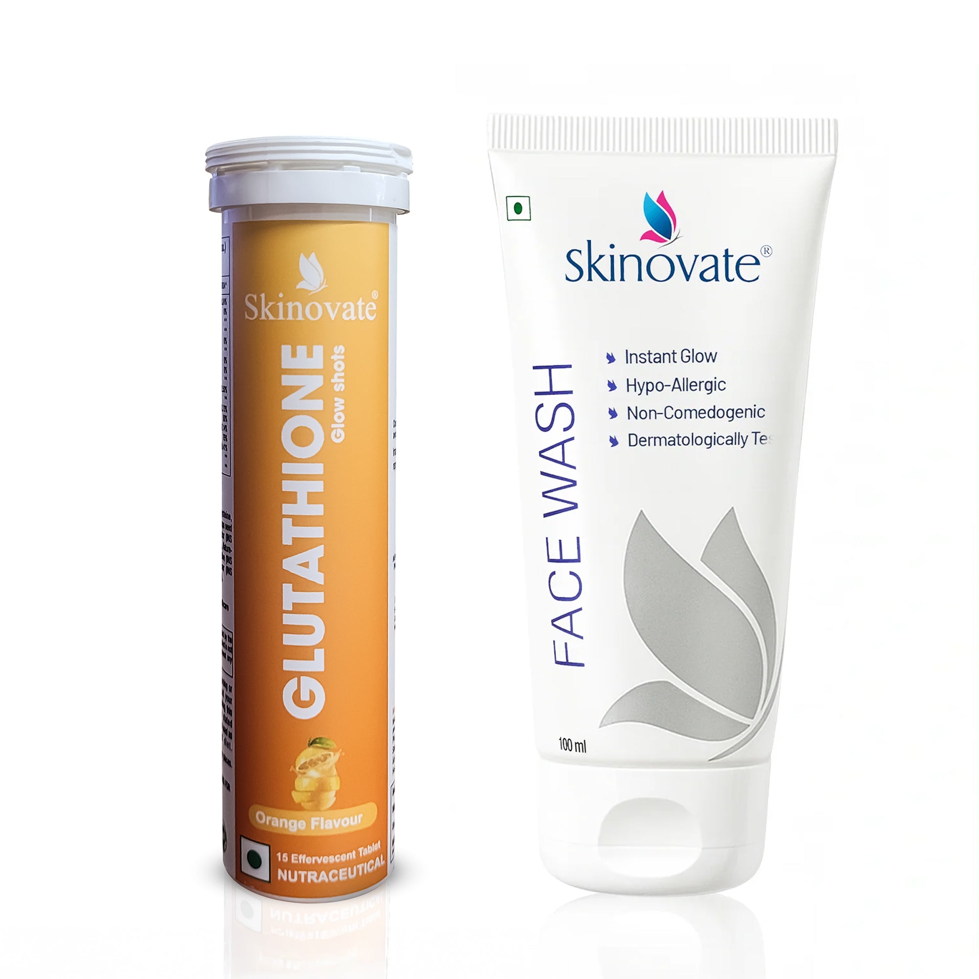 Boost your skin’s natural glow inside and out with the Skinovate Glutathione Glow Shots and get a Face Wash absolutely free! These effervescent tablets help brighten, detoxify, and even out your skin tone from within, while the gentle Skinovate Brightening Face Wash cleanses, refreshes, and leaves your skin instantly radiant.