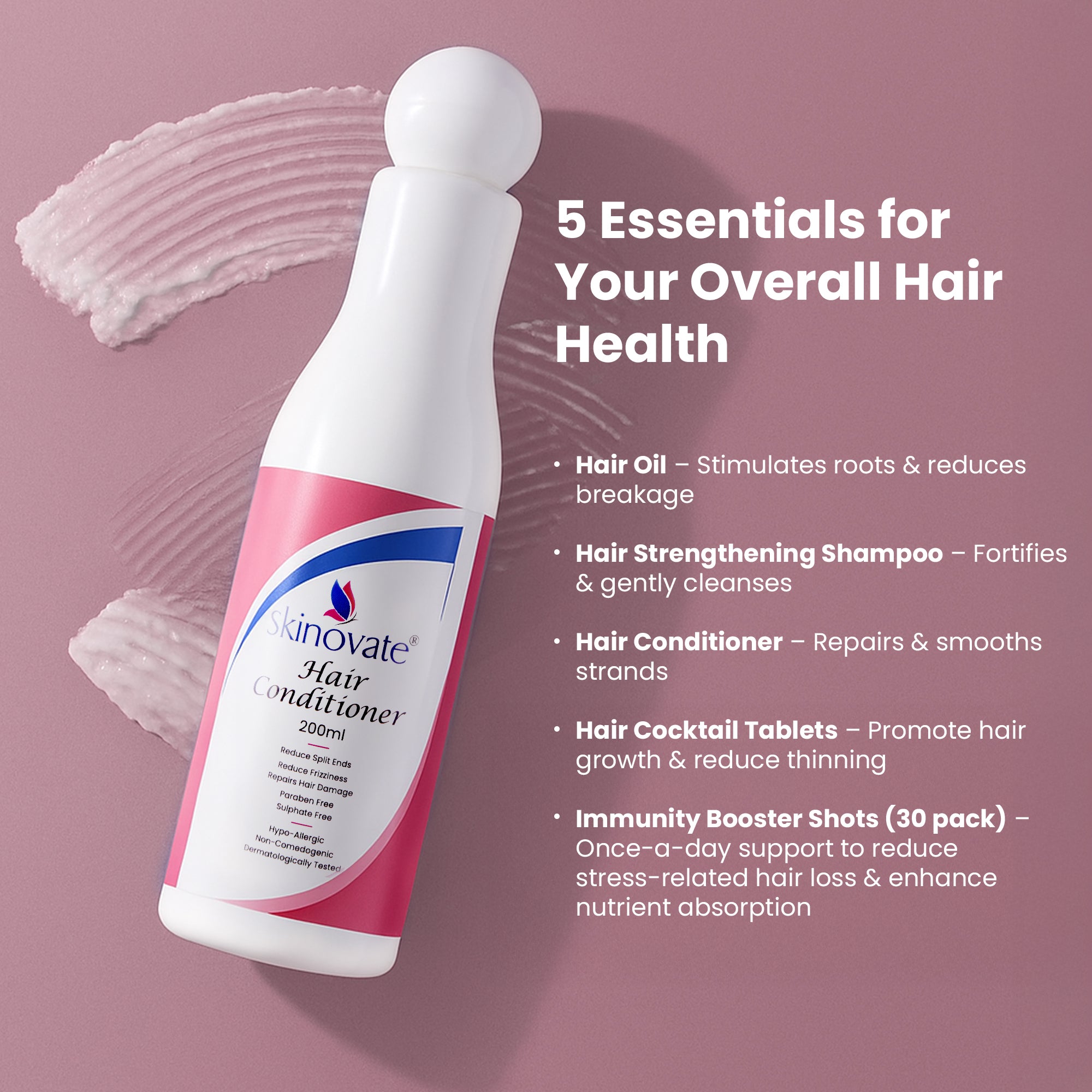 Use Skinovate Hair Strengthening Shampoo followed by the Hair Conditioner to gently cleanse, detangle, and fortify your strands. Infused with D-Panthenol, Biotin, and Protein Complex, this duo helps reduce breakage and improves overall scalp health.